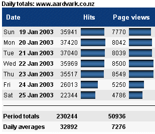Who Reads Aardvark? Amongst the ranks of regular readers you'll find politicians, CEOs, IT managers, web-designers, programmers, the rest of the print, broadcast and online media, government departments, the police, and thousands of ordinary Kiwis, expats and interested people from around the globe. Server logs indicate that Aardvark's front page gets (on average) between 100,000 and 130,000 visits per month, with about another 20,000 views of previously published columns via the archives. This figure is still growing however, and the site is on target for around 180K front-page visits per month by mid-year. (Sever Stats for week ending 25/01/2003 PST or 26/01/2003 NZDT) An NZ web-traffic measurement company has advised that Aardvark is the second most visited site in NZ under the category "News and Media - IT Media". This is a pretty impressive result when you realise that Aardvark goes head-to-head with heavyweight competition such as IDG and Netguide, both of which have the benefit of a large print-media presence with which to promote their websites; and Infotech which is 49 percent owned and operated by media magnate Rupert Murdoch's NewsCorp.