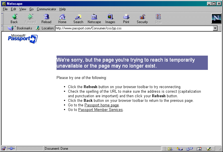 Netscape users see when they try clicking on a link titled "Passport Q&A."