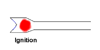 1. Ignition ![]() The effect is that a fireball is produced inside the engine which creates a great deal of heat and pressure. The reed valves are held closed by this pressure, effectively leaving the flame and hot gasses only one place to go...