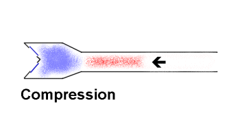 4. Compression ![]() Once again, because they have momentum, the gases in the tailpipe continue to move even after the pressure inside and outside the engine is equalized. This means that the gases continue heading towards the front of the engine -- towards the fresh charge of air and fuel that has just been drawn in. Of course, as soon as the pressure inside the engine becomes higher than the air pressure outside, the reed valves slam shut -- stopping the air/fuel mixture from escaping. This continued movement of the exhaust gases causes the air-fuel mixture to be compressed -- until the hot gases finally travel so far up the pipe that they touch the explosive air/fuel mixture and -- back to step one! This cycle repeats hundreds of times a second -- producing the characteristic buzzing sound of the pulsejet engine.