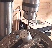 These holes were drilled at a 30 degree angle -- a procedure I was not too sure about because I thought the drill might wander a little when addressing the face of the work so far off-square. The method I finally used was to punch the hole positions then lightly counter-sink the punch-marks with a drill perpendicular to the surface before rotating the table of the drill press to 30 degrees and drilling the pilot holes. The final 6mm holes were then drilled to a depth that meant they all joined up at a focal point in the center of the bar. You may note the lack of measurements at this stage -- I have to admit that when I'm designing and developing I tend to fly by the seat of my pants and use the "looks about right" technique for deciding on dimensions. I can hear you cringing from here :-) Rest assured that I do carefully measure things when it's necessary to ensure that holes line up and components fit together though.