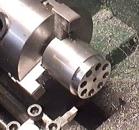 13 September 1999 After fixing my lathe I trued up both ends of the aluminum rod that is to be the intake venturi and reed-valve seat.